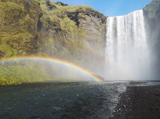 Skógafoss es una de las cascadas más icónicas y fotografiadas de Islandia, es famosa por su caída vertical de 60 metros y su enorme anchura de 25 metros.